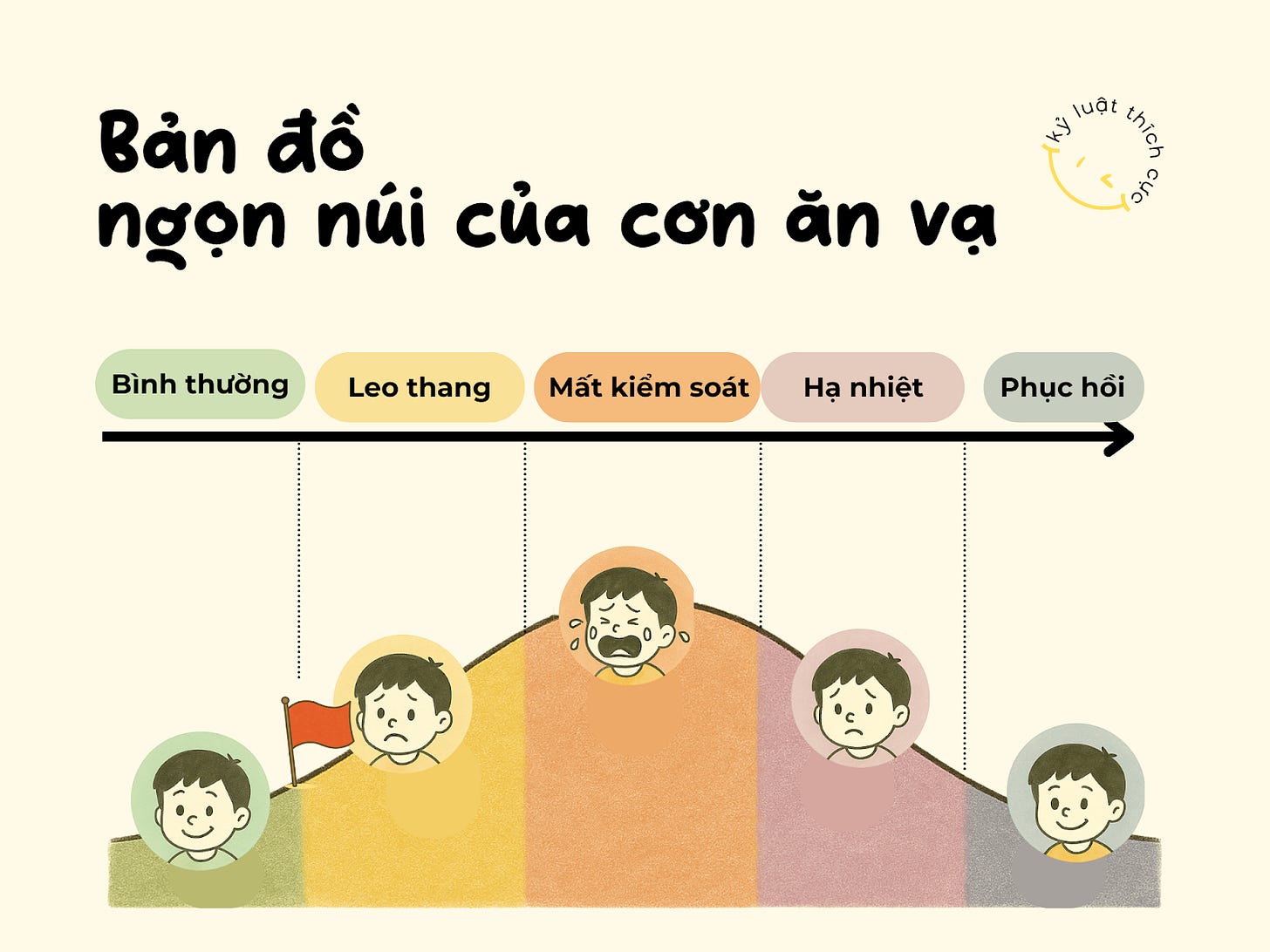 Gọi là “đường cong” nghe … khó hiểu quá. Mình thì thích nghĩ về nó như một tấm bản đồ hình ngọn núi. Cơn ăn vạ không bốc lên đột ngột, mà lên dốc, đạt đỉnh, rồi từ từ xuống dốc, trở lại bình yên.
