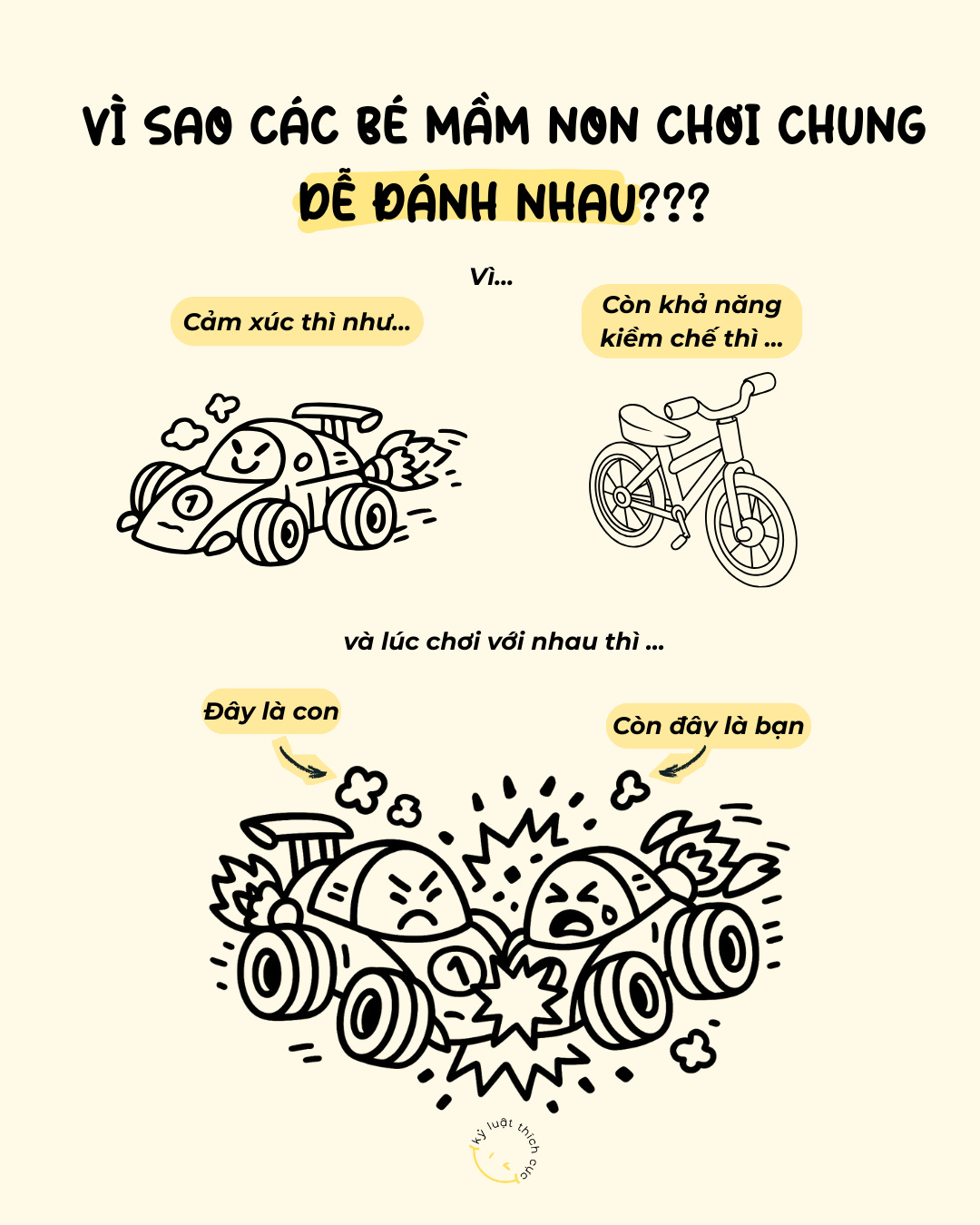 Mỗi khi có một món đồ chơi cả 2 bạn cùng thích, con sẽ cố gắng thật nhanh để giành được món đồ đó. Nếu không giành được, một cảm xúc tức giận bùng lên, chiếc xe đua tức giận tăng tốc lên 200km/h chỉ trong vài giây, phanh xe đạp Thống Nhất muốn “hãm” cảm xúc đó lại nhưng … bất lực. Khói xì ra, và … tay xinh lại đập vào người bạn rồi…